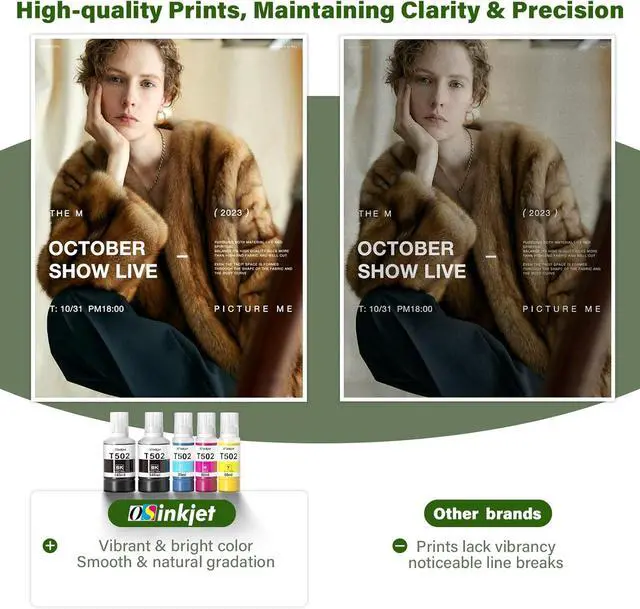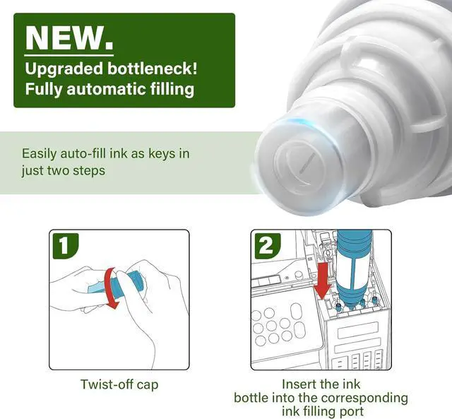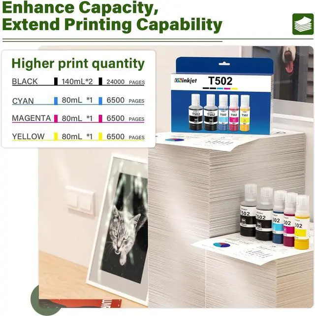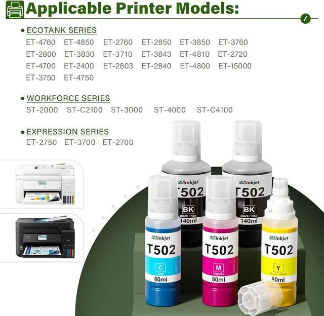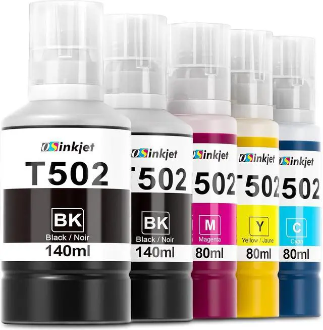 Supercharge Your Printing: The 502 ink refill bottles, with extra-large capacity, let you print up to 43,500 pages (24,000 pages in black, 6,500 pages in each color). Unleash printing efficiency with ease( at 5% coverage on A4 paper). Hassle-Free Refills: Our 502 ink bottles come with an auto-stop design, ensuring no spills, easy filling, and a stress-free experience. Effortlessly replenish your printers, matching the precision of the OEM. True-to-Life Colors: Rigorously tested for pure hues without reddish or bluish issues. Experience vibrant prints that bring life to your colors. Compatible Printer502 ink refill Bottles for Eco tank ET2760 ET-4760 ET2750 ET-3760 ET-2850 ET-15000 ST-4000 ST-2000 ET-3710 ET-3850 ET-3750 ET-4850 ET-3830 ET4750 ET2700 ST3000 ET3700 ST-C2100 ST-C4100 Printer Easy Storage: Individually packed for your convenience, each bottle is a breeze to store.