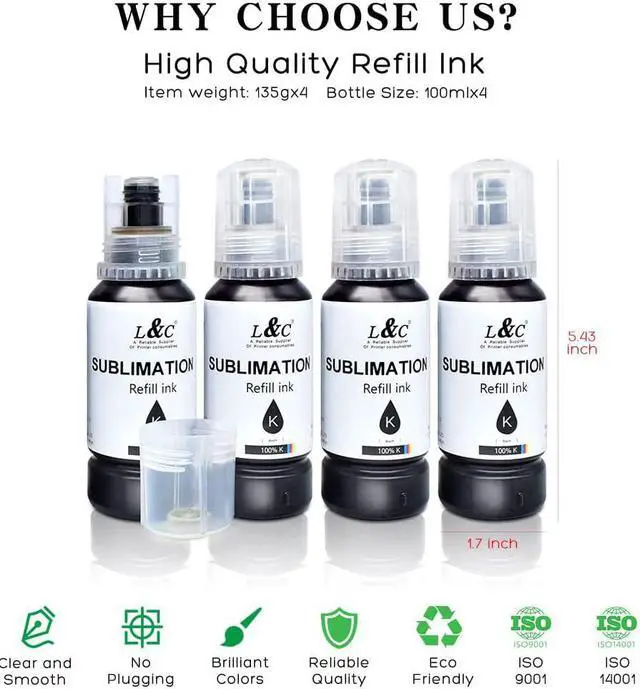 High Quality.Easy to Install and Refill Vibrant Colors & No Fade . 3 layers filtered ink is formulated for heat press transfer printer, No clogging and print smoothly. Anti UV sublimation ink kit has strong stability, Its water resistance and light fastness.ISO 9001 Certified.