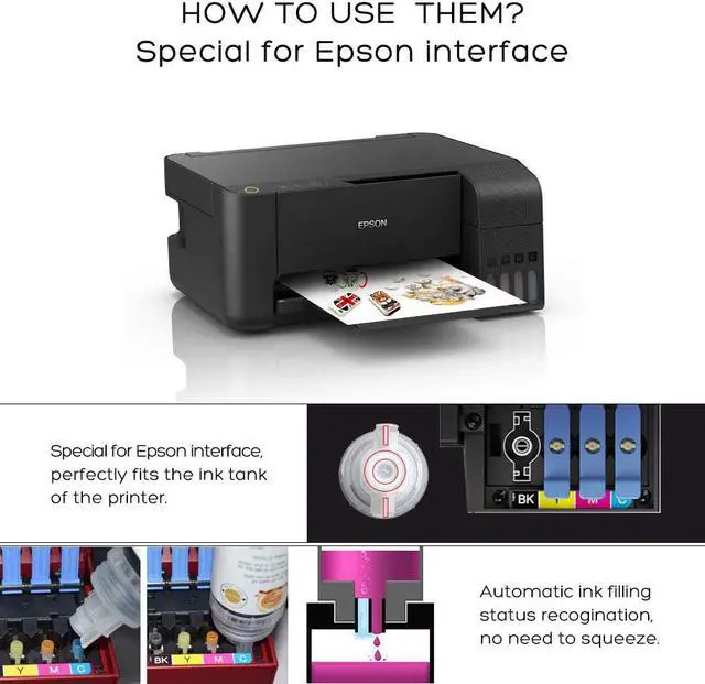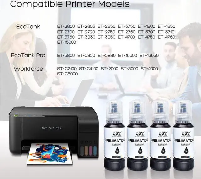 Sublimation Ink Refilled for Epson All Sublimation Printers. High quality sublimation transfer printing ink refills for EPSON WorkForce WF7710 WF7720 WF3640 WF2860 WF2750 WF2650 WF2850 WF3720 WF845 ET2720 ET2750 ET2650 ET2760 ET2550 ET3700 XP440 XP446 XP400 printer.