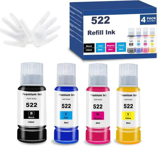 • Package Contents: 4 packs Black and Color Multipack (Including 1 * 522 Black ink refill bottles 140 ml, 1 * 522 Cyan ink refill bottles 80 ml, 1 * 522 ink refill bottles Magenta 80 ml, 1 * 522 Yellow ink refill bottles 80 ml). ( Not Sublimation Ink ) (total 4 pack, 380 ml,i.e 12.8 fl oz)