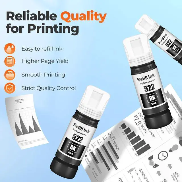 High Capacity for 522 Black Ink Compatible with: et-2800 black ink, et-2400 black ink, et-4800 black ink, et-2803 black ink, et-2840 black ink, et-2720 black ink, et-4700 black ink, et-4810 black ink, 522 black ink refill for ecotank et-2803 ink, ecotank et-2400 ink, ecotank et-4800 ink, ecotank et-2800 ink, ecotank et-2720 ink, ecotank et-4700 ink, ecotank et-4800 ink, 2800 ink, 2400 ink, 2803 ink, 4800 ink, 2840 ink, 2720 ink, 4700 ink, 4810 ink, et-2800 ink, et-2400 ink, et-4800 ink, et-2803 ink, et-2840 ink, et-2720 ink, et-4700 ink, et-4810 ink. High Capacity for 522 Ink Refill Bottles Compatible with: 522 ink black for 2800 black ink, 2400 black ink, 2803 black ink, 4800 black ink, 2840 black ink, 2720 black ink, 4700 black ink, 4810 black ink, et-2400 ink refill, et-2800 ink refill, et-2803 ink refill, et-2840 ink refill, et-4800 ink refill, et-2720 ink refill, et-4700 ink refill, et-4810 ink refill, et2400 et4800 et2800 et2803 et2840 et2720 et4700 ink et4810, for eco tank 2800, eco tank 2400, eco tank 4800, eco tank 2720, eco tank 4700, eco tank 4810, eco tank 2840, eco tank 2803 Printer. [Not Sublimation Ink] for 522 Black Page Yield : Up to 8000 Pages per T522 522 black ink, 5% coverage at A4 paper. Our 522 black ink bottles has auto-stop nozzle design, easy filling, no spills, no drip, no need to squzze the ink bottles! Say goodbye to the hassle of manually squeezing and potentially spilling ink. Sharp Text & Vibrant black: These 522 ink bottles has ink that allows you to print whatever you need, including documents, reports, letters, photos, graphics and much more.