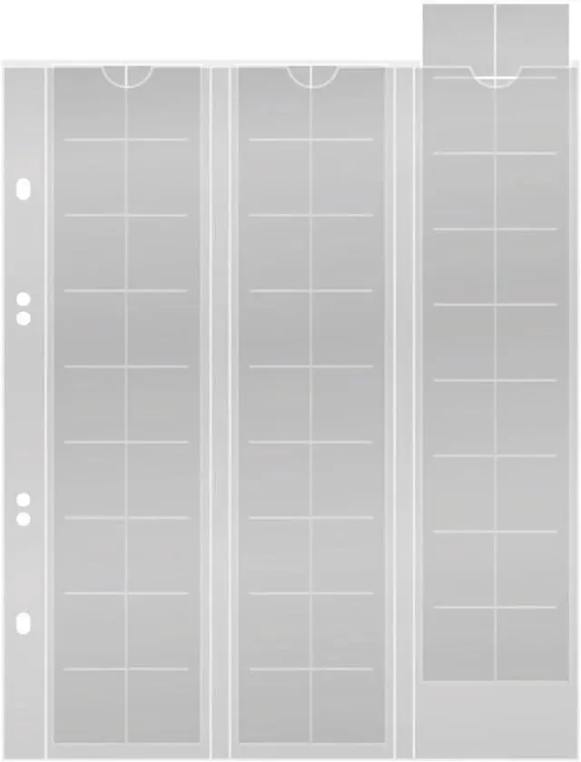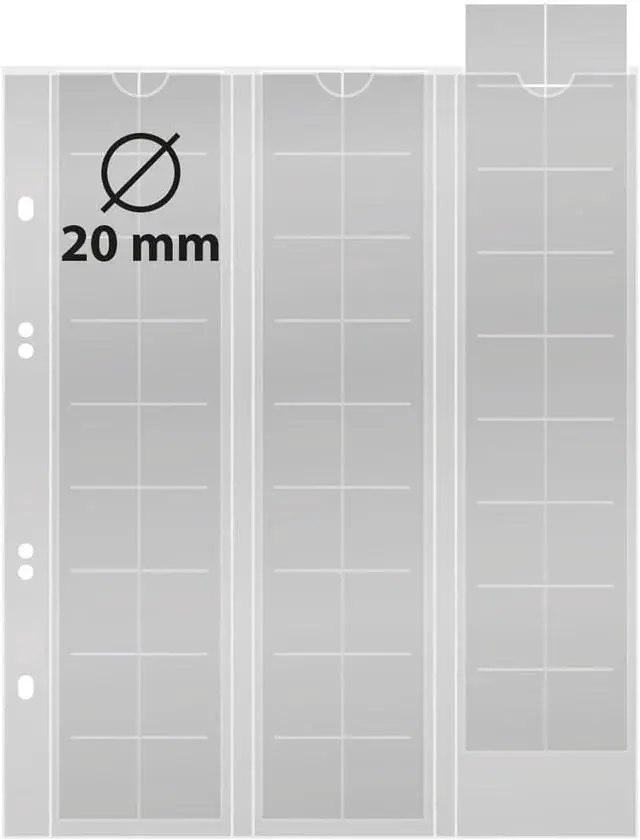 Our crystal clear coin pages provide neat and safe storage of your coin collection. Simply remove the plastic strip from the page and insert the coins in the individual compartments. Once it is filled, insert the strip back into the page - thatÂs it! The pages are easily removed, added, or changed. Multi collect pages will fit in LINDNER ring binder Multi collect ring binder REGULAR (Order no. 1300), Half Penny (Order no.3109), FDC-ring binder REGULAR (Order no.1400), PUBLICA M (Order no. 3530), PUBLICA M COLOR (Order no. S3540) and in many other ring binder with a standard 4-ring mechanism. Multi collect Coin pages for 54 coins up to 20 mm Ø., Black interleaving., External measurements: 202 x 252 mm., , RLO (sales unit): 5 item