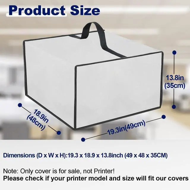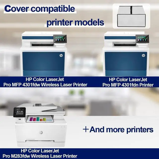 Printer Cover Compatible Models: Fits printers up to (D×W×H) 19.3inch x 18.9inch x 13.8inch(49x48x35cm). Printer cover perfectly compatible with HP Color Laserjet Pro MFP 4301fdw Wireless All-in-One PrinterHP Color LaserJet Pro M283fdw Wireless All-in-One Laser PrinterHP Color LaserJet Pro MFP 4301fdn Printer, and other similarly sized appliances. (Note: Only cover is for sale, not Printer and please check if your printer model and size will fit our covers).