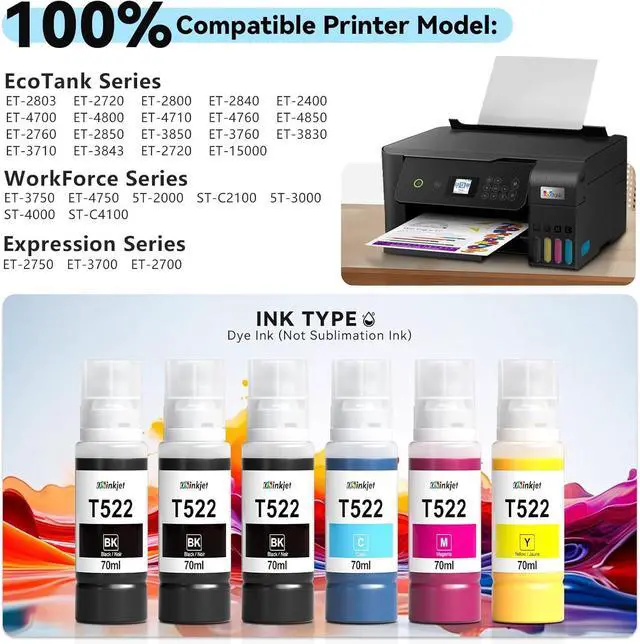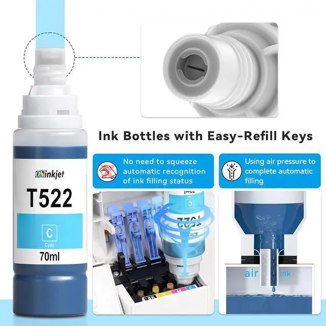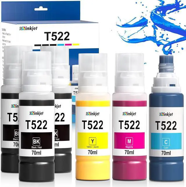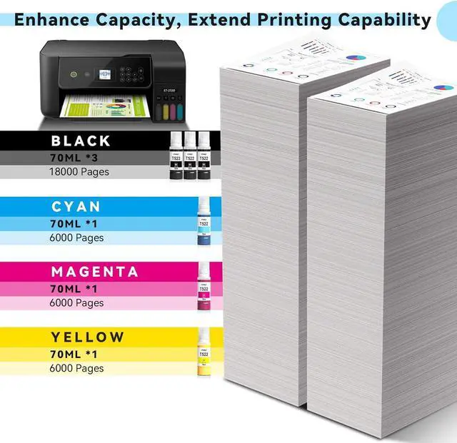 Larger capacity ink bottle, longer life cycle3 bottles of 70ml black 522 ink can print up to 18,000 pages, and each bottle of 70ml color 502 ink can print up to 6,000 pages (5% coverage)