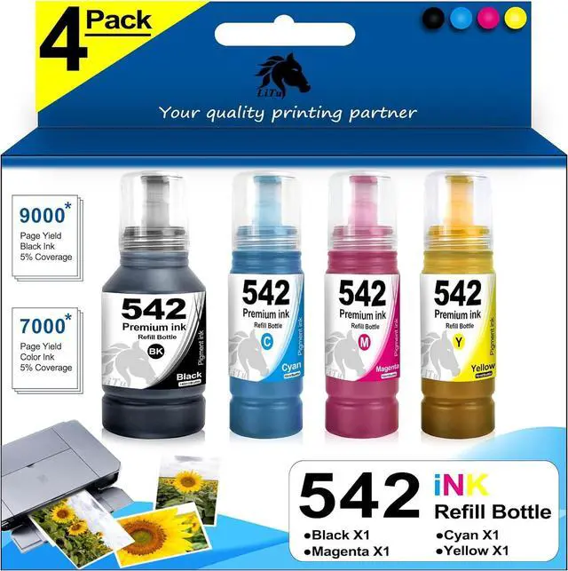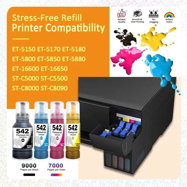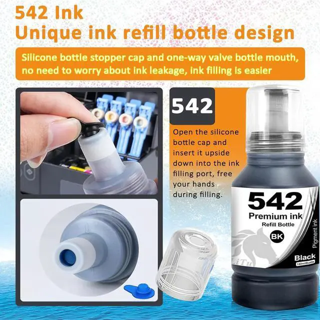 Printer models 542 ink refill bottles use for EcoTank Pro ET-5150 ET-5170 ET-5180 ET-5800 ET-5850 ET-5880 ET-16600 ET-16650 and for WorkForce Pro ST-C5000 ST-C5500 ST-C8000 ST-C8090 Printers.