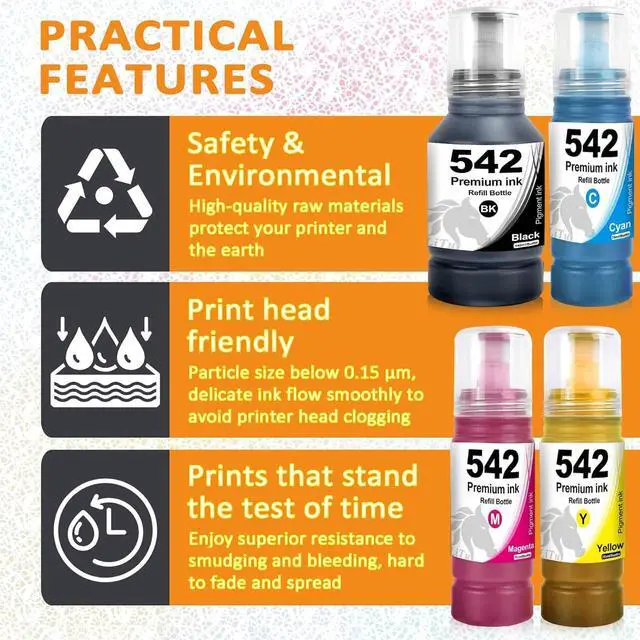 High-quality & Reliable Our compatible 542 ink refill bottles for Epson ecotank printer are manufactured to strict quality standards in an ISO9001, ISO14001, STMC, CE and ROHS certified production lines.