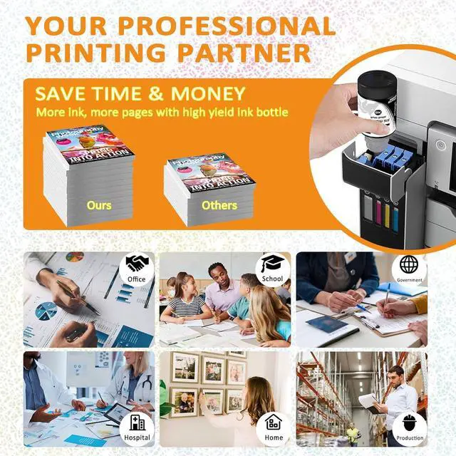 Features The unique bottle mouth (no lock design) makes ink filling easier and more convenient, and leak-proof bottle keeps it safe from shipping. The high-yield ink set offers Premium Inks for smooth gradations and accurate color reproductions, strong color reduction, fast and save more with print. Premium raw material to make sure print smoothly, no damage for print head.