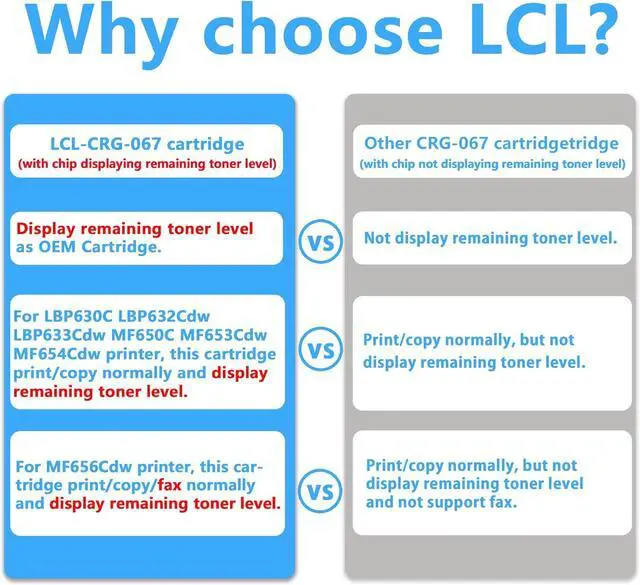 Reliable QualityLCL CRG-067 toner cartridge uses high quality toner, toner particle size distribution, good mobility, high transfer rate, resulting in a clear image and high gloss print effect; Printing efficiency is high, waste powder rate is low, so as to ensure sufficient page yield.