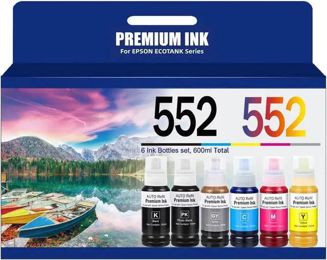 Package Contents: 1 x Black 552 Ink Refill Bottle 100ml, 1 x Pigment Black 552 Ink Refill Bottle 100ml, 1 x Cyan 552 Ink Reill Bottle 100ml, 1 x Magenta 552 Ink Reill Bottle 100ml, 1 x Yellow 552 Ink Reill Bottle 100ml, 1 x Gery 552 Ink Refill Bottle 100ml (Total 6 Pack, 600ml ), use for Ecotank EcoTank ET-8550 and EcoTank ET-8500