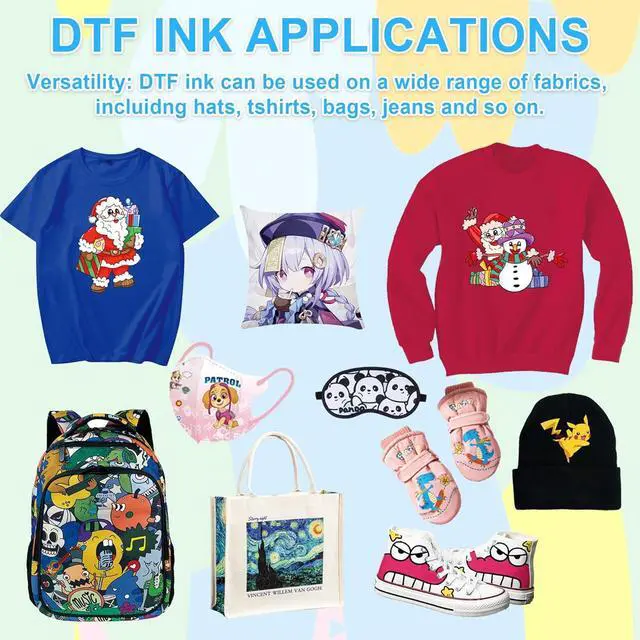 DTF Ink Applications: DTF ink is suitable for printing and dyeing of all fiber fabrics, including cotton, cotton linen, modal, silk, and other protein fibers; Besides, it is also widely used for polyester, nylon, spandex and other chemical fibers and other blended products. Specific applications include T-shirts, denim, hoodies, decorative fabrics, wall coverings, curtains, fabric sofas, and bedding.