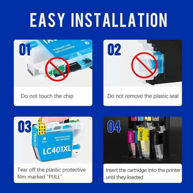 Package contents:1 Black, 1 Cyan, 1 Magenta, 1 Yellow for Brother LC401 Ink Cartridges (4 Combo Pack LC401XL in Total NON-OEM Cartridges)