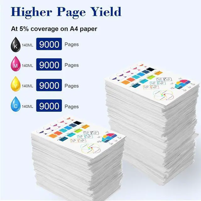 GI26 Ink Refill Bottles Set Include : 5 Pack compatible for Canon MAXIFY GI26 Ink Bottles ( 2*140 ML GI26 Black Ink Bottles, 1* 70ml GI26 Magenta Ink Bottles, 1* 70ml GI26 Yellow Ink Bottles, 1*140ml GI26 Cyan Ink Bottles ). Compatible for Canon GI-26 Refill Bottles, it prints up to 9,000 pages in both black and color ( 5% coverage )