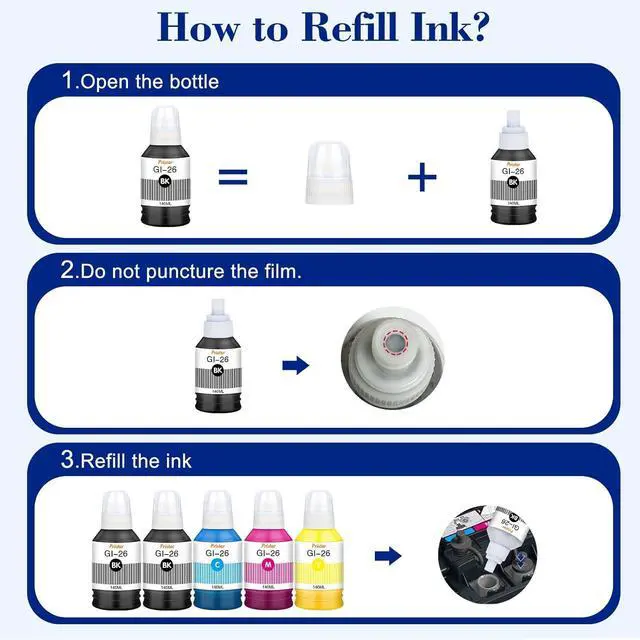 Warm Note : Please confirm whether your printer model is suitable for gi-26 ink bottles before purchasing. Please clean the ink tank and the print head before using these ink bottle refill to reach a better printed effect. Since the dye ink and pigment ink can not be mixed, please check carefully before install the refill ink.