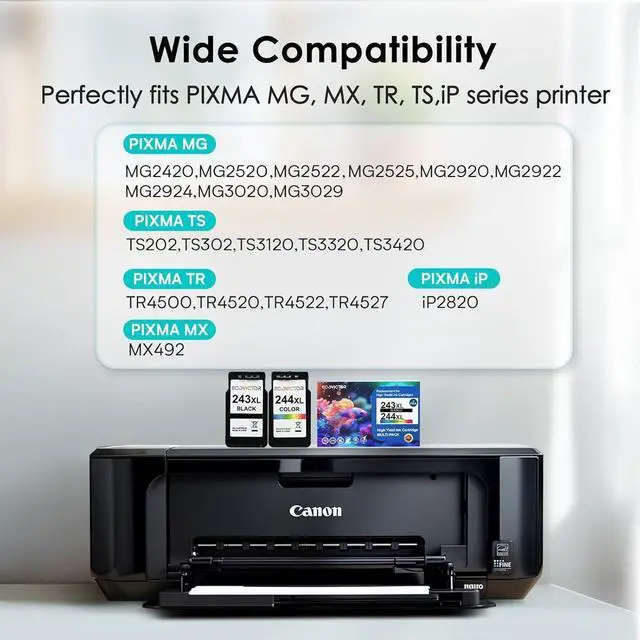 Suitable For The Following Printers: Eco Victor 243 and 244 ink cartridges are compatible with PIXMA iP2820, MG2420, MG2520, MG2522, MG2525, MG2920, MG2922, MG2924, MG3020, MG3029, MX492, TR4500, TR4520, TR4522, TR4527, TS202, TS302, TS3120, TS3320, TS3420 (please confirm your printer).