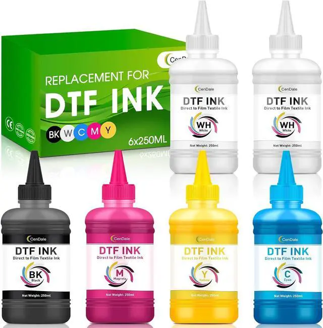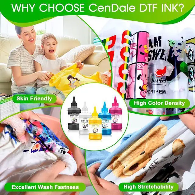 WHAT YOU GETCenDale Inkjet Printers Heat Transfer Film Printing Ink, 250ml of Cyan, Magenta, Yellow and Black and 500ml of White. ICC profile available DTF ink.
