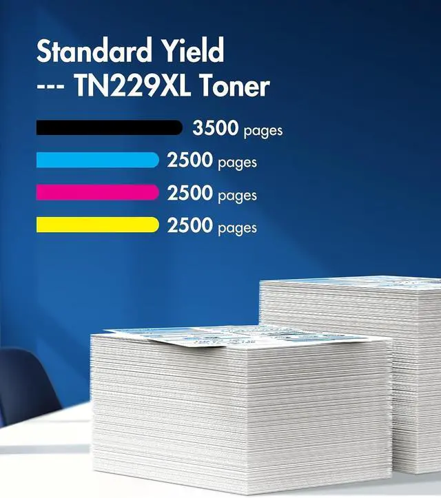 3. High Page Yield: Up to 3000 pages for TN229XL bk TN229 Black toner and 2300 pages for per TN-229XL color toner (TN229XL C/TN229XL M/TN229XL Y), (Letter/A4, at 5% coverage) | Also available for TN229 toner
