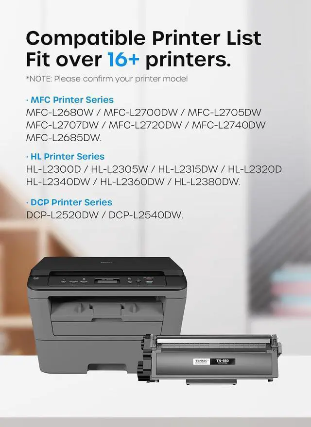 Printer Compatibility: TN660 toner cartridge works for Bro HL-L2300D HL-L2305W HL-L2315DW HL-L2320D HL-L2340DW HL-L2360DW HL-L2380DW MFC-L2680W MFC-L2700DW MFC-L2705DW MFC-L2707DW MFC-L2720DW MFC-L2740DW MFC-L2685DW DCP-L2520DW DCP-L2540DW Laser Printers
