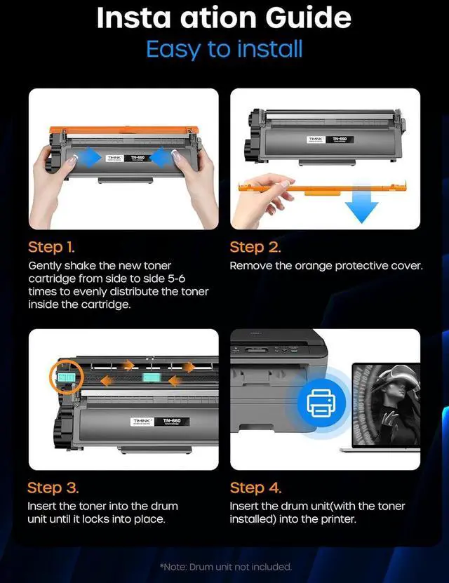 Package Contents: 4 x TN660 TN-660 Black toner cartridges (Total 4 Pack). This is TN660 Toner Cartridge ONLY. Drum Unit is not included