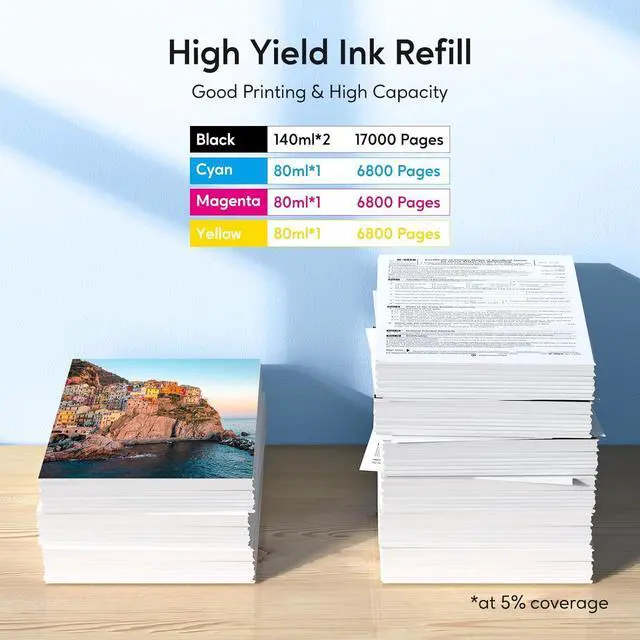 Page Yield: 2 bottles of 140ml black ink can print up to 17000 pages, each 80ml color bottle can print up to 6800 pages (5% coverage at A4 paper).