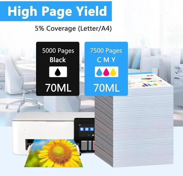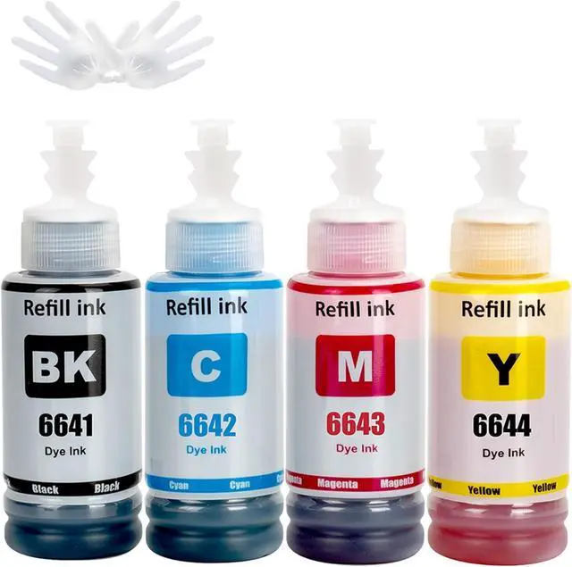 High CapacityExtra-large capacity ink bottle, longer replacement interval. Includes 4 Ink Bottles: Up to 5000 pages per T6641 black ink bottle in 70ml; 7500 pages per T6641 Cyan/Magenta/Yellow ink bottle in 70ml (with 5% Coverage of A4 paper).