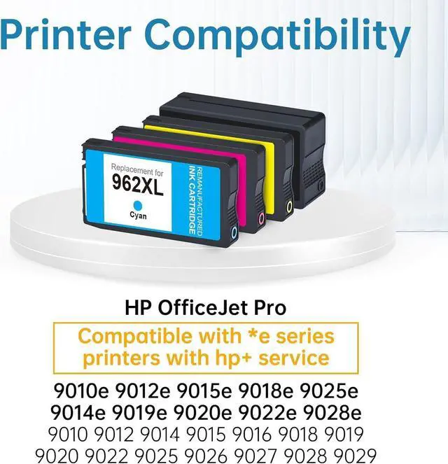 962XL Ink Cartridges Combo Pack Compatible with *E Series Printers: Compatible with HP OfficeJet 9015e ; Compatible with HP OfficeJet Pro 9010e / 9014e / 9012e / 9016e / 9018e / 9019e / 9020e / 9022e / 9025e / 9026e / 9027e / 9028e / 9029e Printers