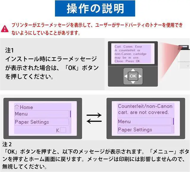 Important Note - - This is a Non-OEM product. Before installing a compatible toner cartridge, CANON Genuine mode must be turned off. The steps are as follows: Menu > Admin Settings > Device Management > CANON Genuine Mode > Off. When the prompt "A non-CANON ink cartridge may be inserted" appears, press the "OK" key and the toner cartridge will work normally.