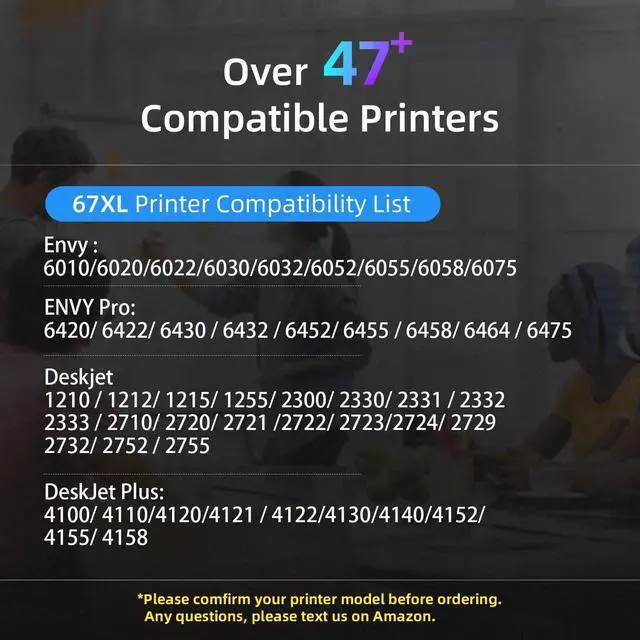Compatible for: for DeskJet 2700 2700e 2710e 2720e 2721e 2722 2722e 2723e 2724 2725 2732 2734e 2742 2742e 2752 2752e 2755 2755e 1255 2855e 4100 4100e 4120e 4121e 4122e 4123e 4130e 4132e 4152e 4155e 4158e 4155; for DeskJet Plus 4122 4132 4152 4155 4158 4255e; for Envy 6000 6010e 6020e 6022e 6030e 6032e 6034e 6050e 6052 6052e 6055 6055e 6065e 6075 6075e 6420e 6422e 6430e 6432e 6450e 6452e 6455e 6458e 6475e; for Envy Pro 6455 6458 6475 6452