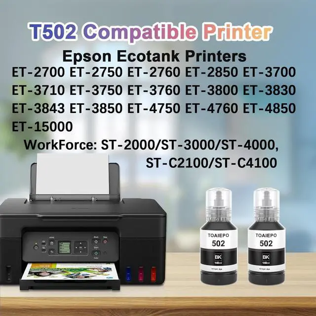 T502 Ink Bottles replacement work with Expression ET-2700,ET-2750,ET-2760,ET-2850,ET-3700,ET-3710,ET-3750,ET-3760,ET-3830,ET-3850,ET-4750,ET-4760,ET-4850,ET-15000 printer ,WorkForce ST-2000,ST-3000,ST-4000,ST-C2100,ST-C4100 printer .