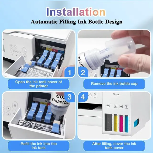 Automatic filling design: TOAIEPO designs the bottom port based on the principle of adding ink to the printer, making it easy to fill with ink. Interrupt at any time, automatically stop when fully filled. Make your printing easier