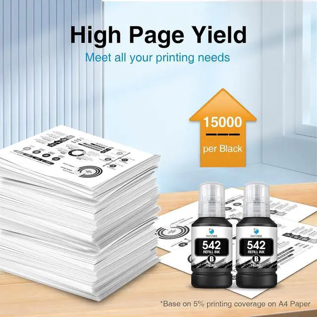 542 ink High Page Yield:542 Pigment Ink Up to 7500 pages per 542 Black bottle,total 15000 pages of 542 ink package at 5% coverage on A4 paper