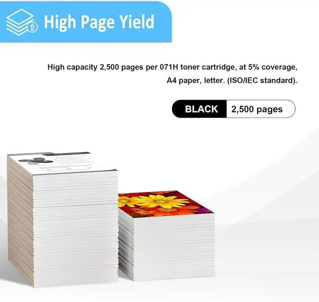 What You Will Get - - 1 pack compatible 071H toner cartridge ( 5646C001 ) with latest data chip, provide real-time toner level monitoring; Replacement for Canon 071 / 071H toner cartridge.