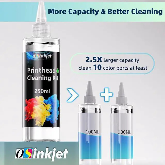 What's In The Box: Printhead cleaning solution 100ml, 20ml syringe x 1, fat-tip swab x 4, combo connector x 3, diposable gloves x 1 pair. Osinkjet printer head cleaning kit does not damage the printer. If you have any questions, we will solve them online 24 hours x7.