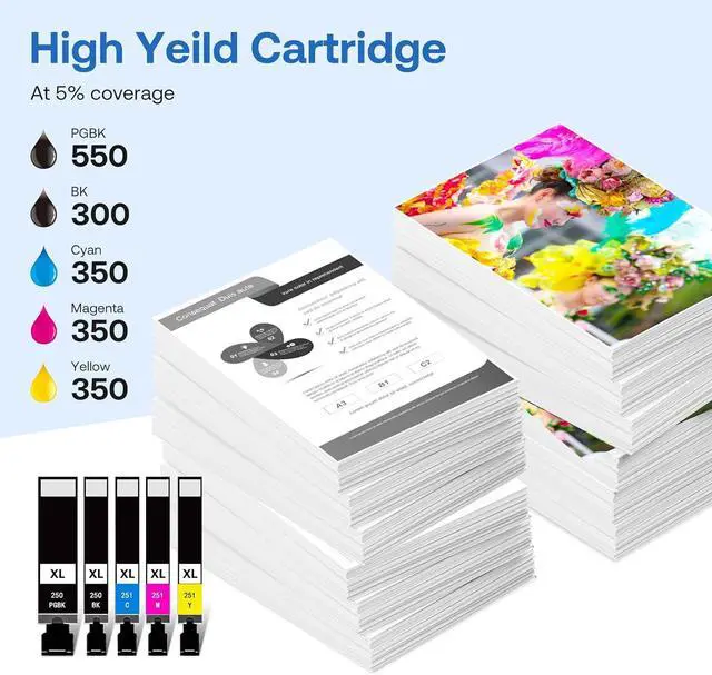 PGI-250XL CLI-251XL 5 Color Value Pack, Compatible for Canon 250 251 XL Ink Cartridges to use with PIXMA MX922 MX722 MG5420 MG5520 MG6320 MG6420 MG6620 iP7220 (PGBK, Black, Cyan, Magenta, Yellow). Large capacity cartridges meet your printing needs and can be used in the office, home, school. Black provides clear text, color provides bright pictures.