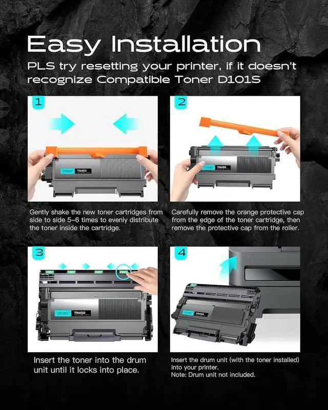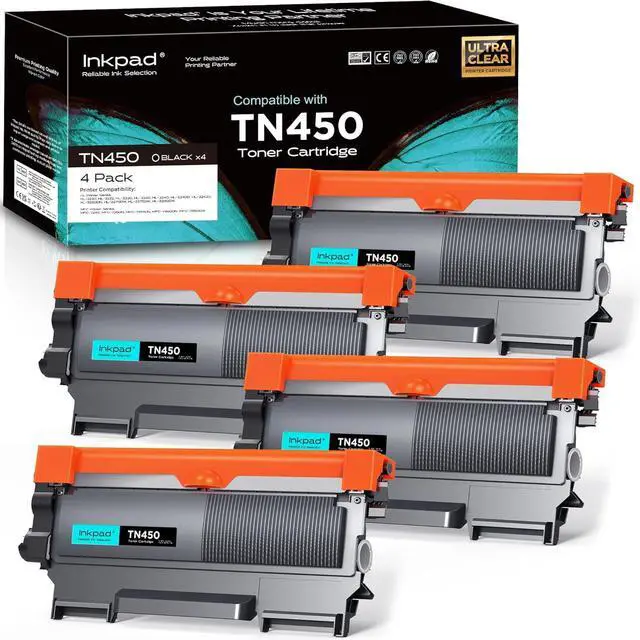 Package Contents: 1 x User Guide, 4 x compatible TN450 TN420 black toner cartridges (Drum unit is NOT included)
