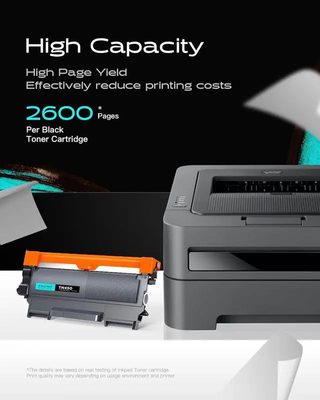 Cartridge Yield (approx.): Higher capacity and Print More with iNKPAD Compatible TN-450 TN-420 toner cartridges, 2600 pages per black at 5% coverage.