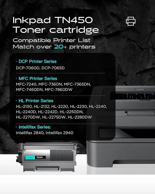Count on high-quality, reliable printing and save time by avoiding common printing problems. iNKPAD compatible TN-450 toner cartridge delivers a printing experience that's essential for office productivity.