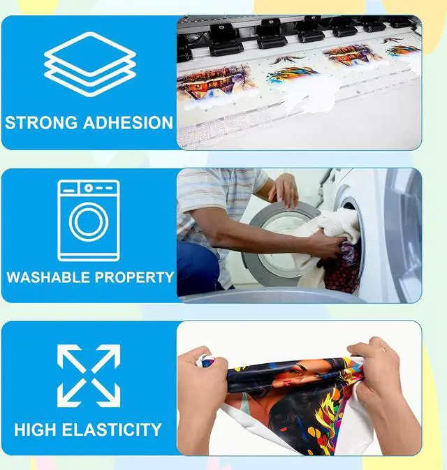 Features: Highly durable and static-free. Double-sided matte film. High-rate color transfer. Strong ink absorption and uniform coating. Transfers clear prints in vibrant colors. High-temperature resistance. Compatible with all DTF printers. Works on both light and dark fabrics. Cold peel. Size: 13x328ft (33cm×100m) roll film. Packaging: 1roll/box.