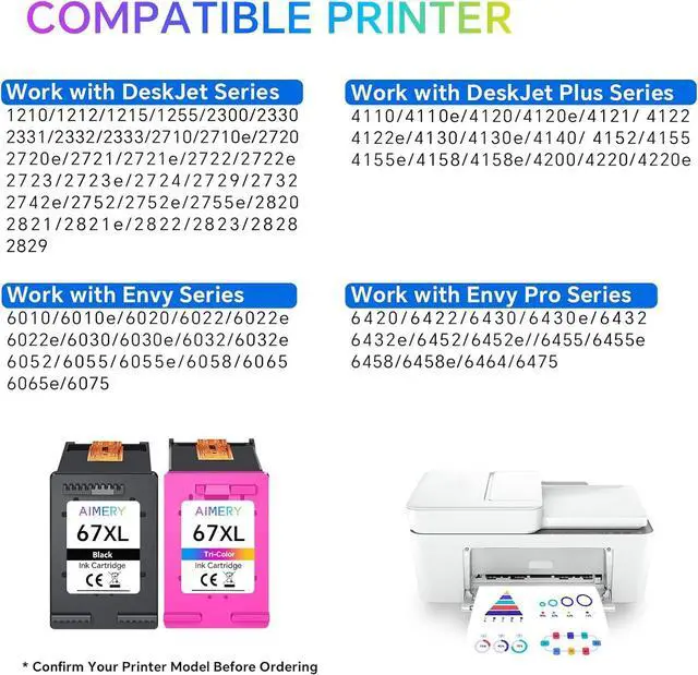 Works with hp DeskJet ( Plus ) 2700 2734e 2755e 4100 1255 2300 Series, ENVY ( Pro ) 6000 6020e 6022e 6032 6052 6065 6420 6432e Series, 67xl for hp 67xl ink cartridges simple drop-in replacement design ensures quick cartridge changes with no hassle