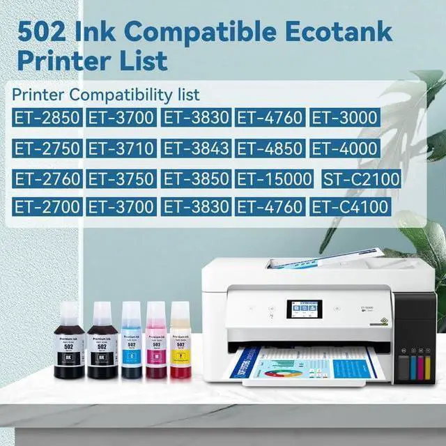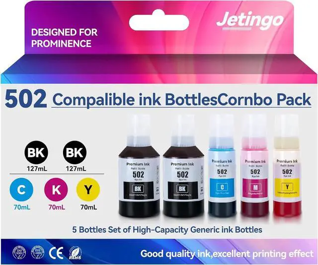 Compatible Printers:Jetingo 502 ink refill Bottles for Epson WorkForce ET2760 ET-4760 ET2750 ET-3760 ET-2850 ET-15000 ST-4000 ST-2000 ET-3710 ET-3850 ET-3750 ET-4850 ET-3830 ET4750 ET2700 ST3000 ET3700 ST-C2100 ST-C4100 ET-2720 ET-4700 ET-2830 ET-4800 Printer