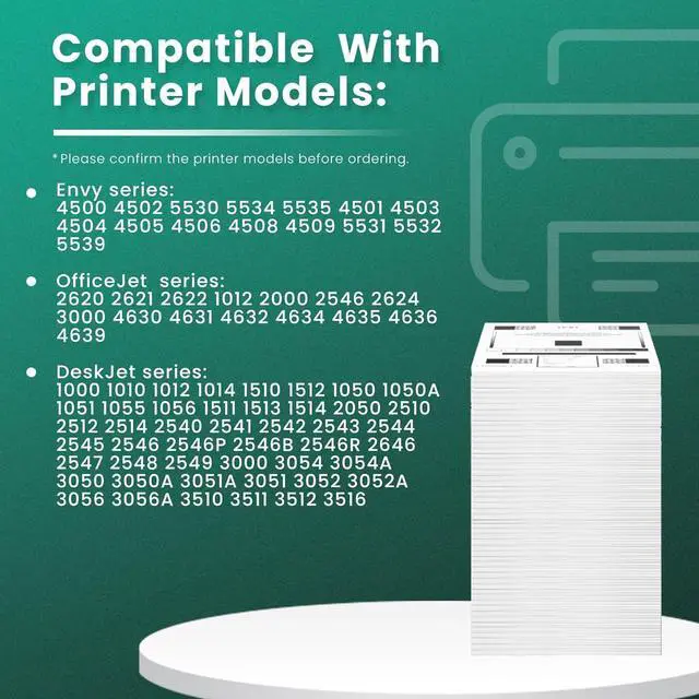 Compatible with: HP Envy 4500 4502 5530 5534 5535 4501 4503 4504 4505 4506 4508 4509 5531 5532 5539, HP OfficeJet 2620 2621 2622 1012 2000 2546 2624 3000 4630 4631 4632 4634 4635 4636 4639, HP DeskJet 1000 1010 1012 1014 1510 1512 1050 1050A 1051 1055 1056 1511 1513 1514 2050 2510 2512 2514 2540 2541 2542 2543 2544 2546 2546P 2546B 2546R 2646 2547 2548 2549 3000 3054 3054A 3050 3050A 3051A 3051 3052 3052A 3056 3056A 3510 3511 3512 3516 Printer