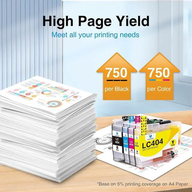 High Page Yield for LC404 Ink Cartridges: Up to 750 Pages per Black LC404 Ink Cartridges, 750 Pages per Color LC404 Ink Cartridges (Letter/A4, At 5% Coverage)