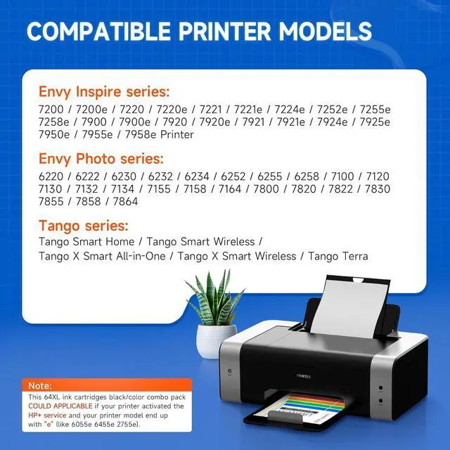 Compatible for 64xl ink cartridge combo pack fit for : Tango Smart Home, Tango Smart Wireless, Tango X Smart All-in-One, Tango X Smart Wireless, Tango Terra Printer