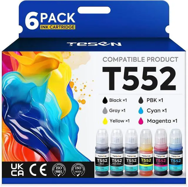 [Package Contains] 6 Packs of Epson 552 Ink Bottles (70ml each) - 1 Photo Black, 1 Black, 1 Cyan, 1 Magenta, 1 Yellow, and 1 Grey.