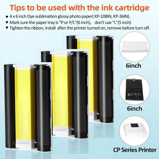 Package Included: 3-Pack Ink Cassettes Compatible with Canon Selphy KP-108IN KP108 Color Ink Cartridges (4 x 6 inch). Each ink cartridge can prints 36 sheets 10 x 15cm(100 x 148mm) photo paper, total 108 prints (Paper not included).