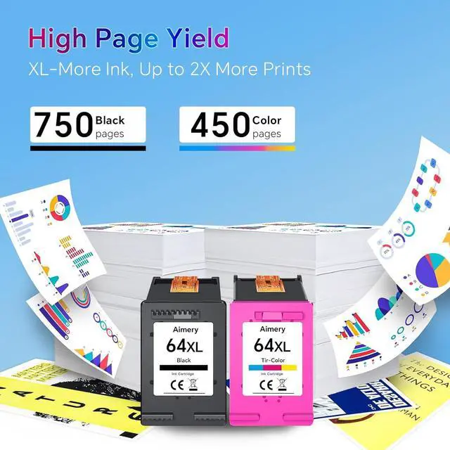 High Yield printer ink for hp 64 ink: 750 Pages for hp 64 ink cartirdges black, 450 Pages for hp 64XL colour (at 5% coverage) of premium quality prints for extended use
