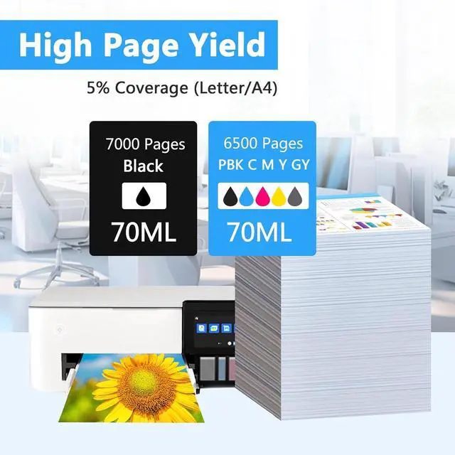 Total 6 ink bottles (1 Photo Black+1 Black+1 Cyan+1 Magenta+1 Yellow+Grey); The capacity is 70 ML per ink bottle.