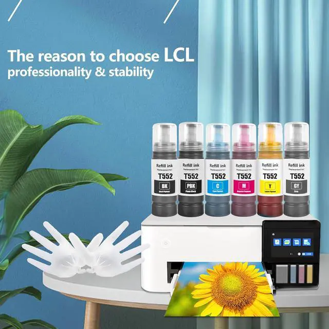 LCL T552 (Photo Black,Cyan,Magenta,Yellow,Grey) ink is dye ink which have a low diffusion coefficient, resulting in a layered and brightly colored print. In addition, its surface tension properties make it easy for the ink to be absorbed by the surface of the paper, so that the print remains glossy, dye ink is a complete composite solution, not easy to clog the print head.