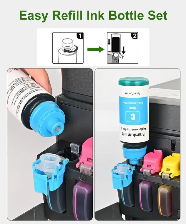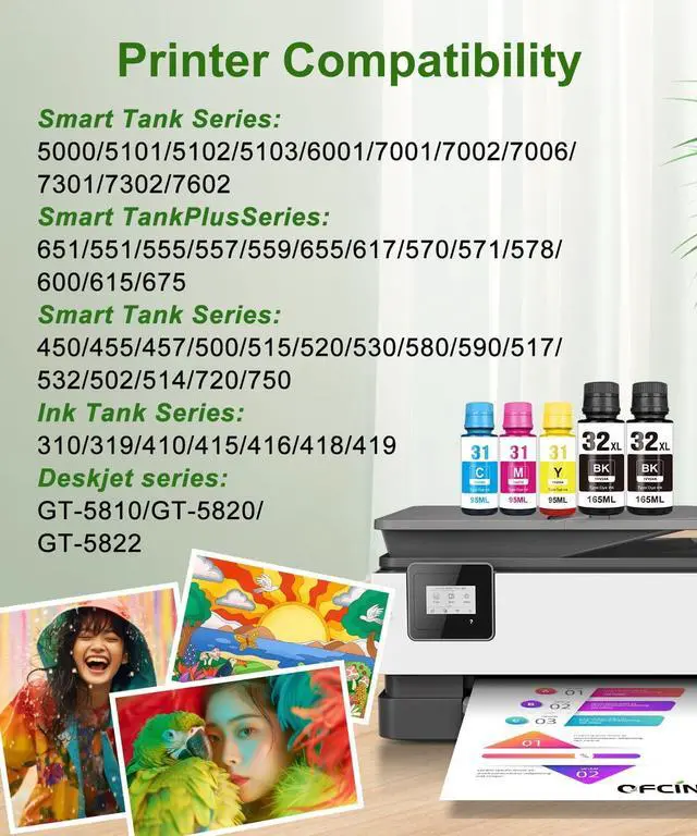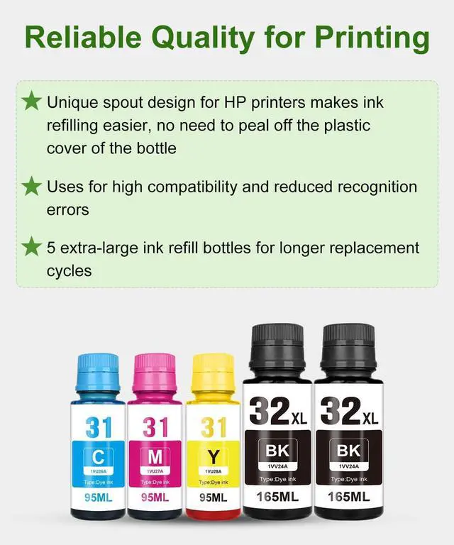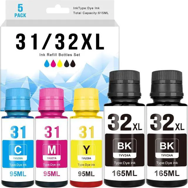 5 Pack 31 32XL Refill Bottle : The 32XL black ink bottle and 31 ink are compatible with hp smarttank 5101 6001 5000 7301 7602 , smarttank plus 651 ink refill. Easily refills your SmartTank printer and meet your office and home printing needs at any time