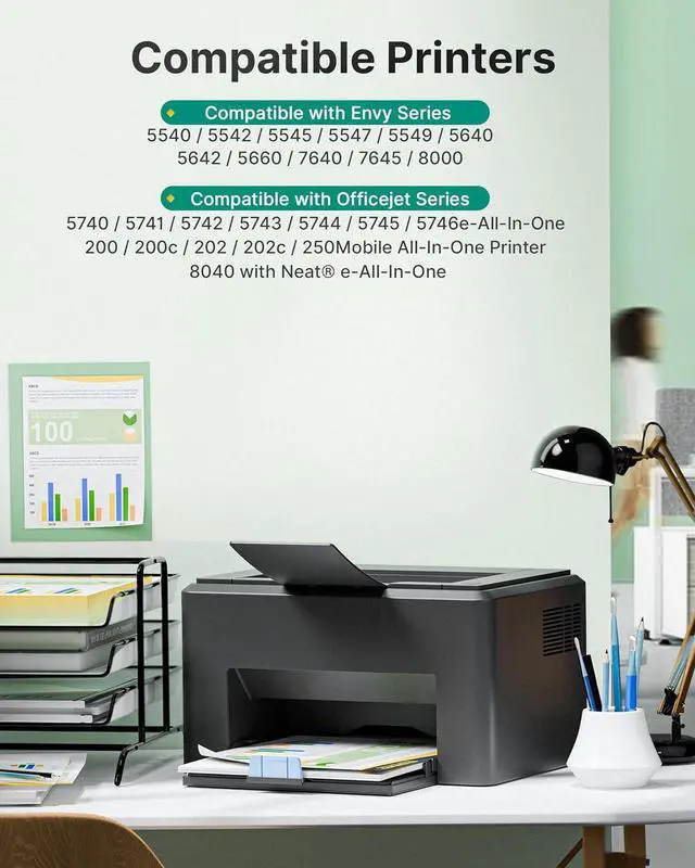 These 62xl ink cartridges black and color work with: HP ENVY 5540, 5541, 5542, 5543, 5544, 5545, 5547, 5548, 5549, 5640, 5642, 5643, 5644, 5646, 5660, 5661, 5663, 5664, 5665, 7640, 7643, 7644, 7645, 8000, 8005, OfficeJet 200, 250, 285, 5740, 5741, 5742, 5743, 5744, 5745, 5746, 8040, 8045 series printer