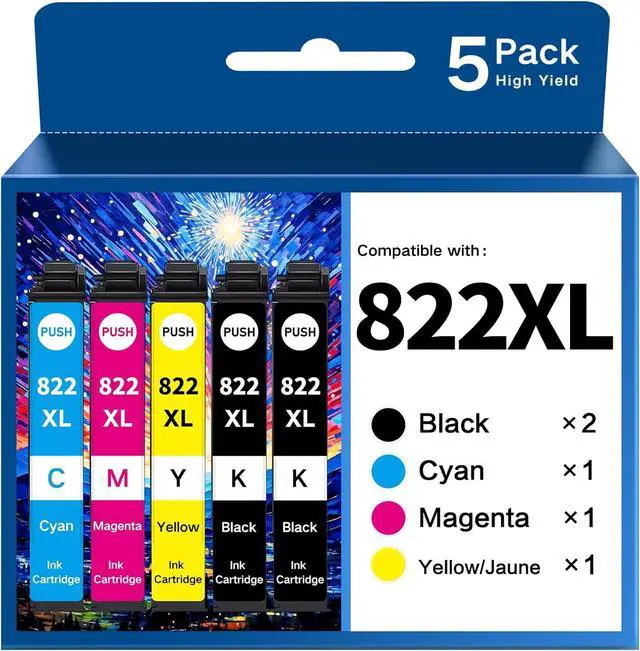 High capacity ink cartridge replacement for epson 822xl 822 t822 contents: 2 x 822xl black ,1 x 822xl cyan ,1 x 822xl magenta ,1 x 822xl yellow ,total 5 cartridges.(Note: Due to different batches, the packaging of products may differ from that on the detail page.)